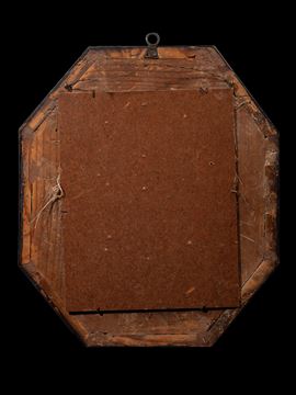 Raro reliquiario in rame dorato, di forma lobata, impreziosito da applicazioni in corallo scolpite a imitazione di motivi fogliacei. Al centro, una raffinata ghirlanda a volute in argento racchiude la figura di un santo in corallo rosso.