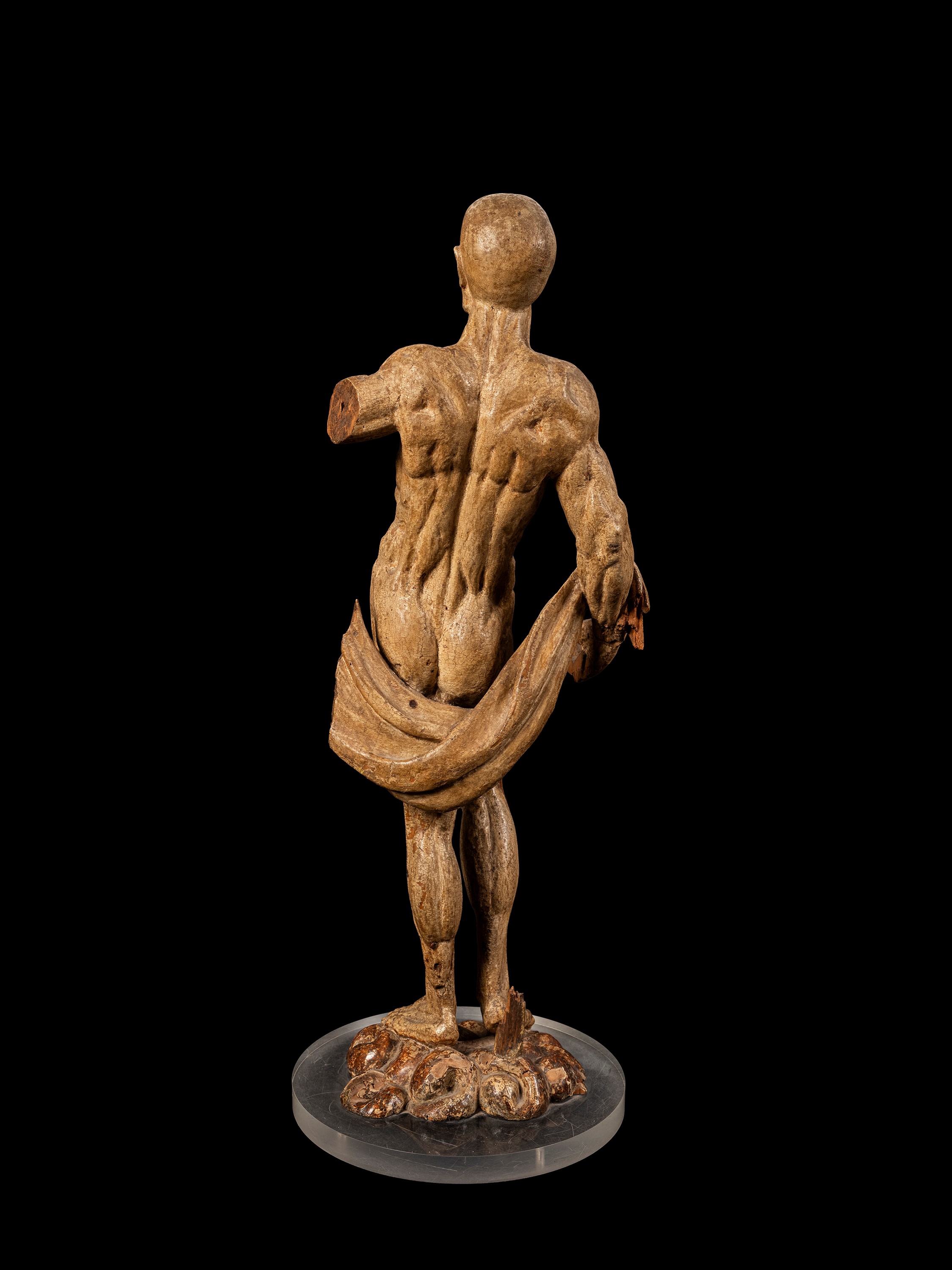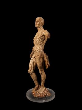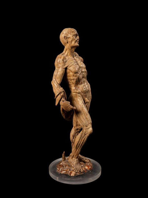Raffigurante un modello anatomico scorticato, ispirato a un prototipo di Jean-Antoine Houdon, poggia su base circolare in plexiglass.