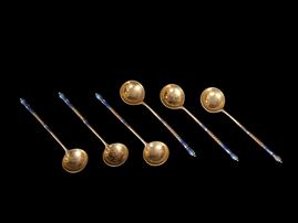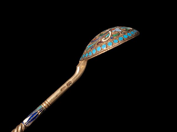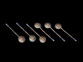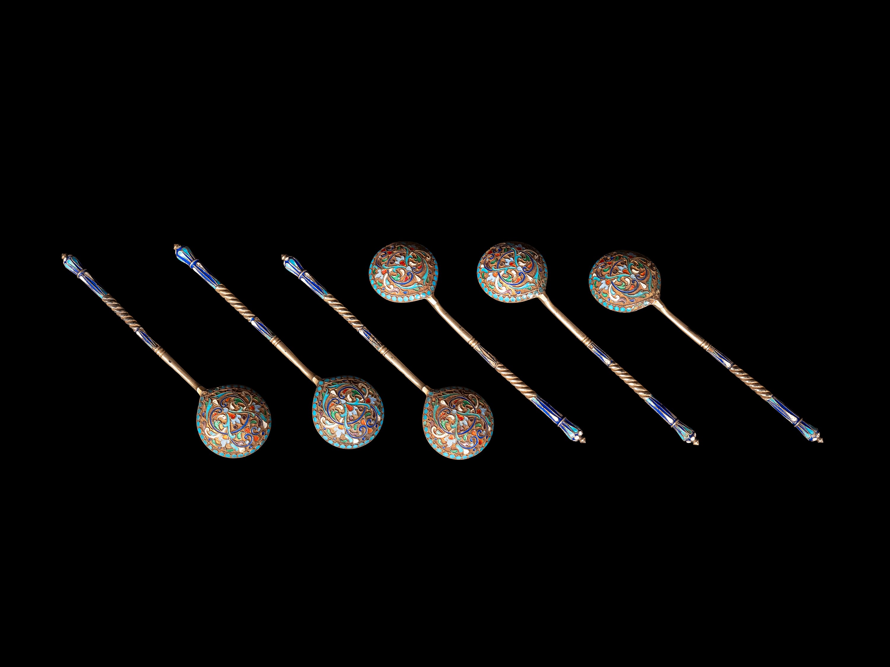 SEI CUCCHIAINI IN ARGENTO SMALTATO GUILLOCHÈ, Russia, fine XIX secolo