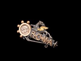 In stile Castellani, con moneta incastonata in stile romano e iscrizione ROMA. Peso g 21.