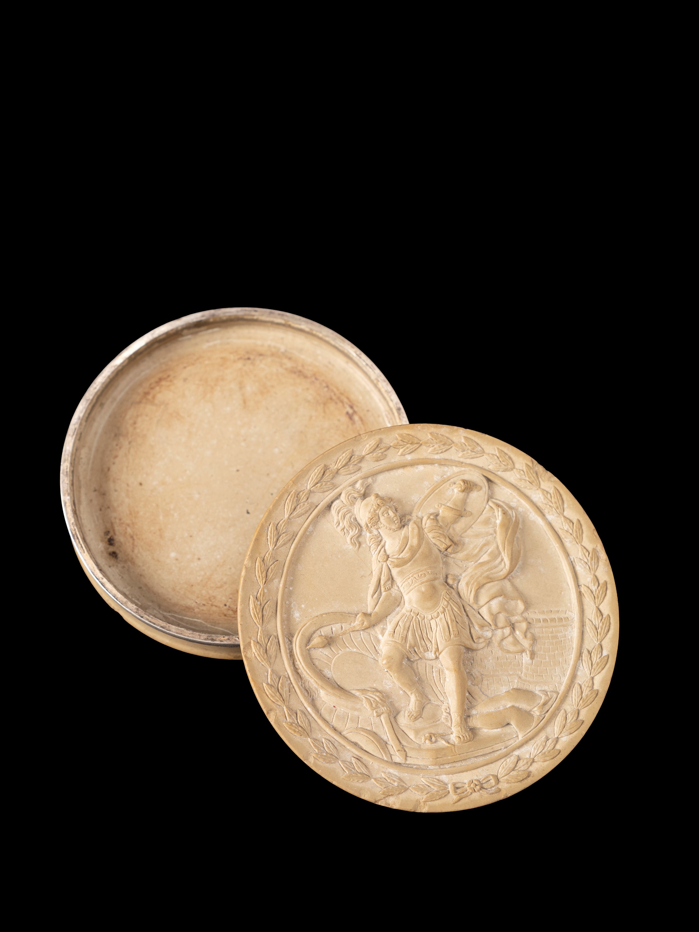 Di forma circolare, raffigurante soldato con lancia e scudo.