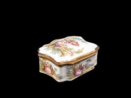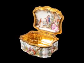 Finemente decorata, sia all’interno che all’esterno, con scene galanti, è probabilmente attribuibile alla manifattura di Meissen, pur in assenza di marchi.