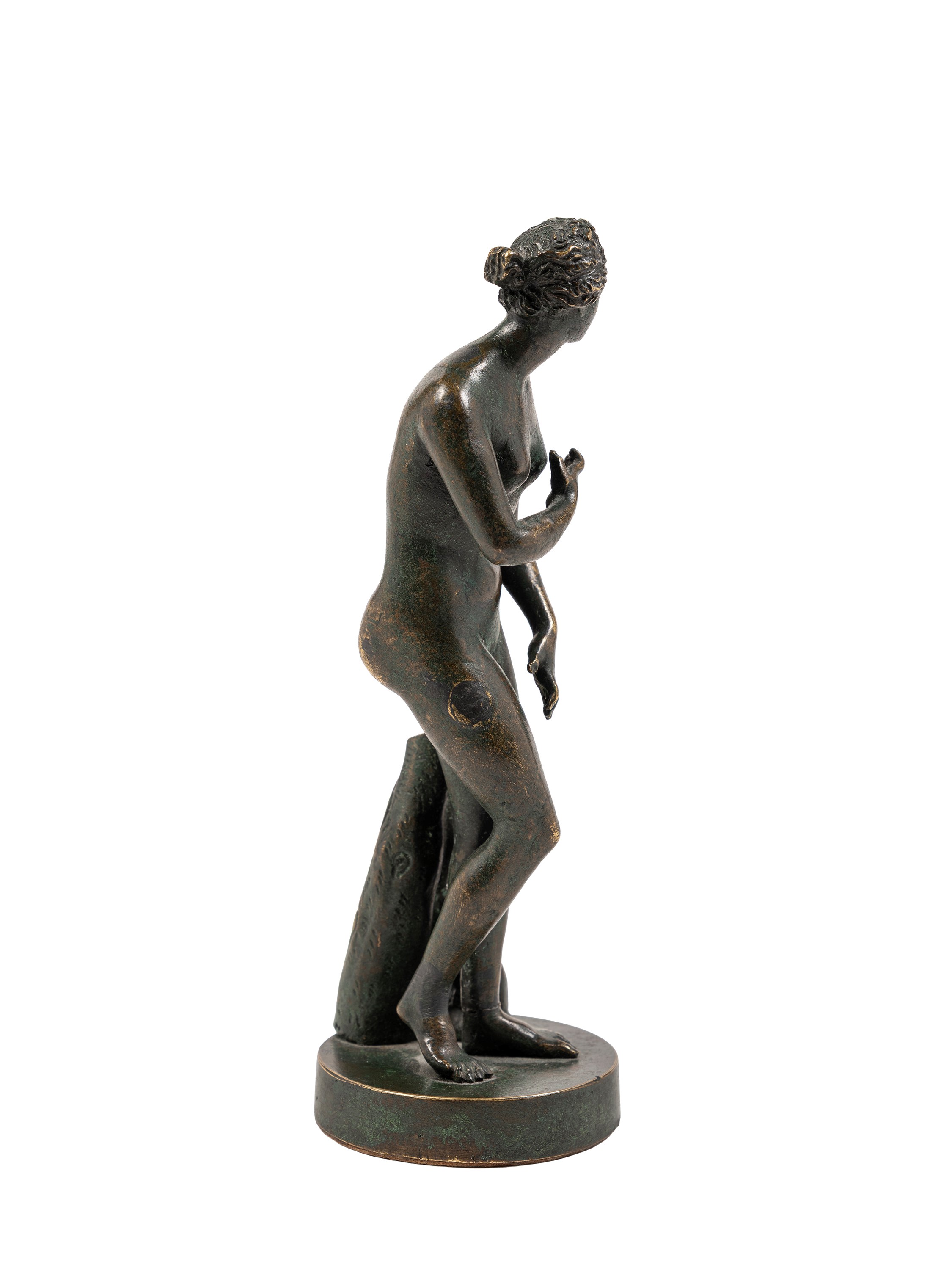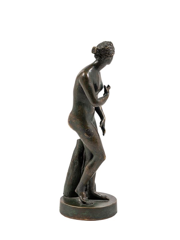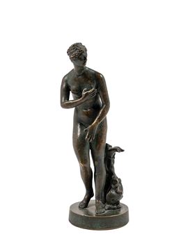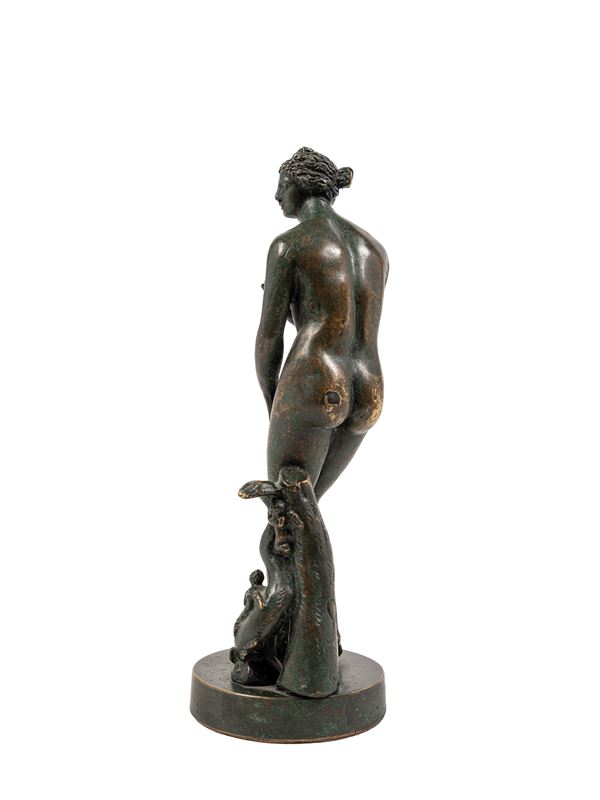 La dea nuda, in piedi accanto a un delfino con due putti, su base circolare con tipica patina verde scuro/nera.
