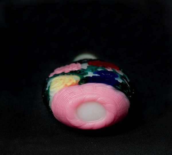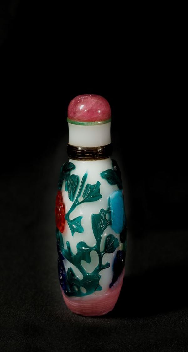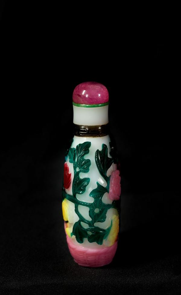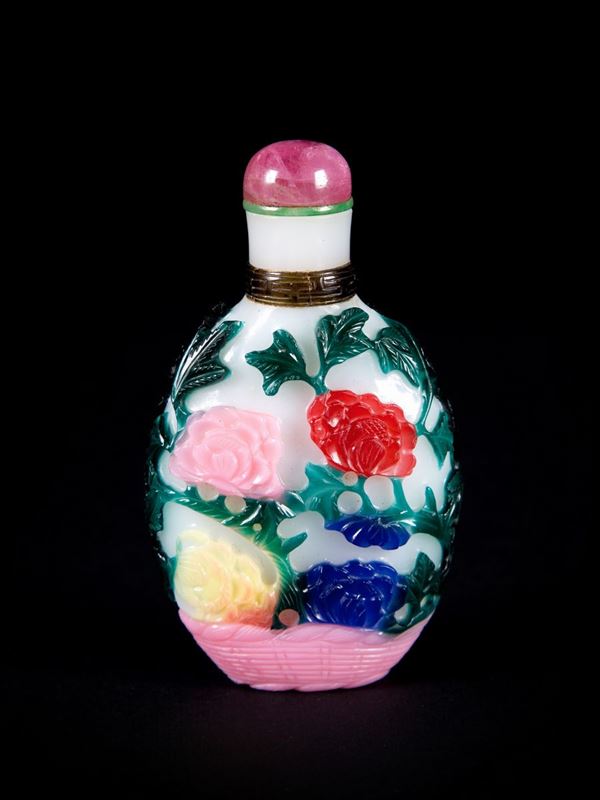 The bottle is carved on a white ground with a continuous design of peonies and chrysanthemums springing from a rock in red, pink, yellow, violet, turquoise and green, all on a white glass ground; the neck is bordered by a brown glass band with a greek fret. Glass stopper.
