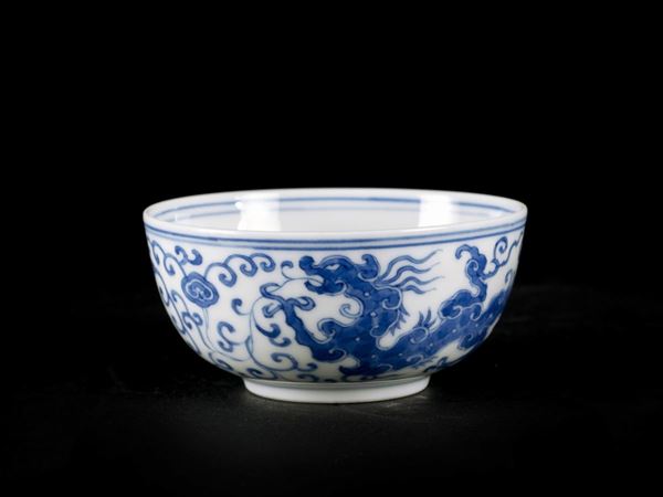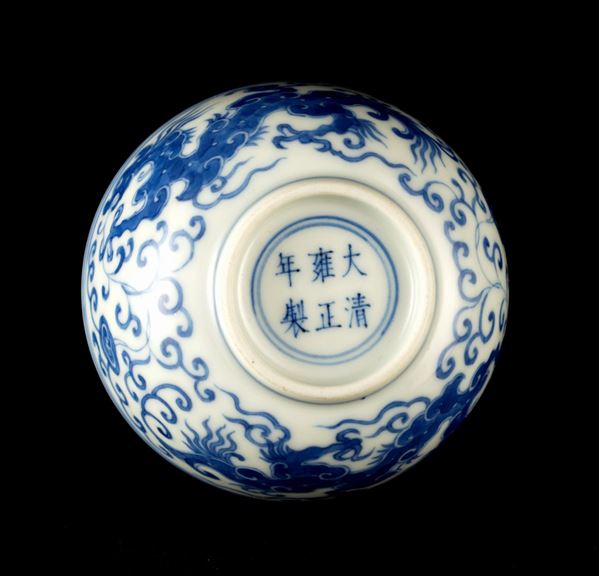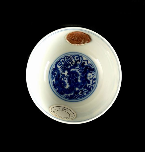 Well painted in underglaze blue, it is decorated on the outside with two qilongs between floral motifs; on the inside in the center there is a medallion with a qilong. In the center of the base it bears the six-character mark in underglaze blue of Emperor Yongzheng. It bears two old labels on the inside.