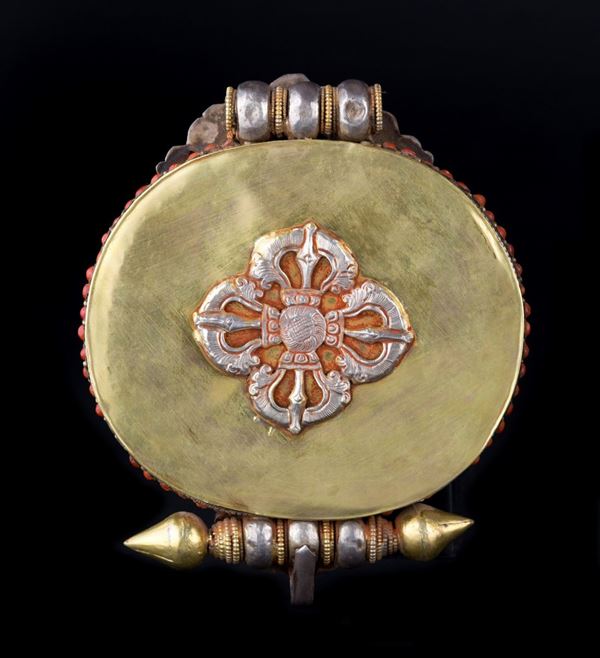 Box for relics or amulets (gau) of religious nature. The front, in silvered, gilt and embossed copper, is embellished with very fine chiselled work further enriched by settings of turquoises, corals and other semi-precious stones. In the centre of the box stands out, carved in turquoise the effigy of Padmasambhava, depicted seated on a lotus throne, wearing a beautiful dress and adorned with earrings and necklaces, while his head is crowned with a lotus-shaped hat. In his hands he holds his attributes. The back of the reliquary depicts a double vajra in silver-plated copper on a gilded background.