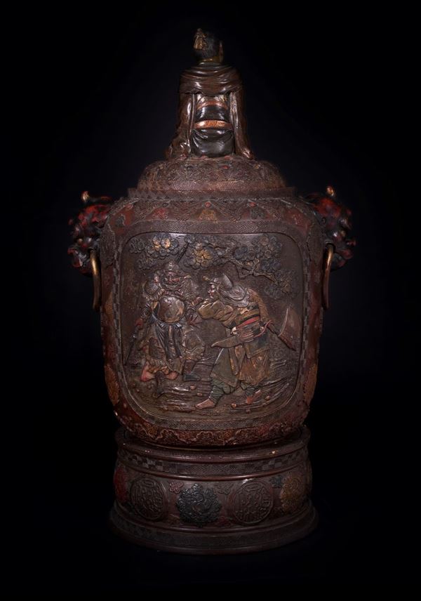 Well molded and decorated resting on its pedestal, it depicts warriors in the centre and around it are applied ceramic medallions carved in the shape of phoenixes. On either side are two monster-head shaped handles carrying two rings in their mouths. The lid culminates in a kneeling sage. The ceramic support on which it rests also features the same motifs as the vase.