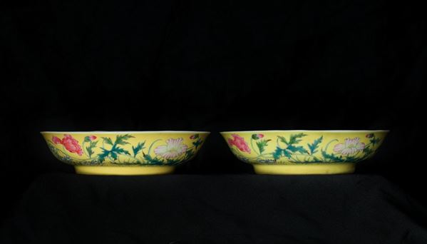 Well painted on a yellow background with flowers in famille rose enamels, on the reverse side they bear inscriptions. In the centre of the base is the apocryphal four-character square mark in overglaze blue of Emperor Yongzheng.