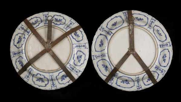 Decorated in the kraak style, they are lobed on the rim and well painted in blue underneath with reserves depicting animals, flowers and insects, and in the centre one presents storks and the other two fawns, all under a pine tree. On the back are reserves with flowers.