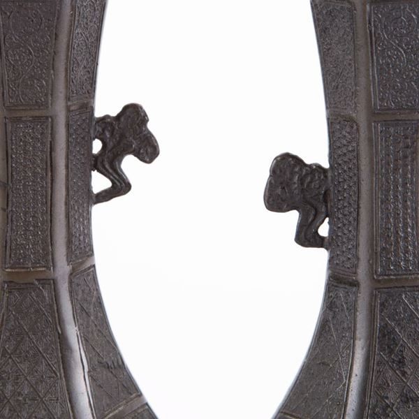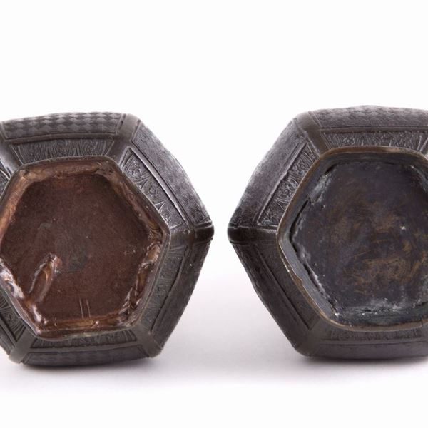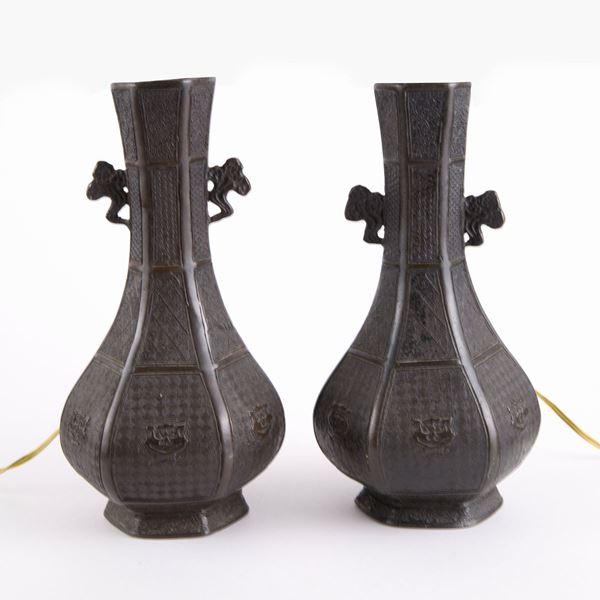 Pair of brown patinated bronze vases with hexagonal section and flared foot. Each side is decorated with reserves with geometric motifs, applied two cloud-shaped handles.