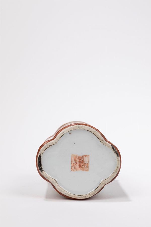 Poly-lobed in shape with a rust background and reserves containing children playing; bears the apocryphal mark of the Jiaqing Emperor.