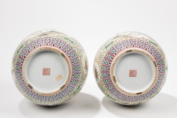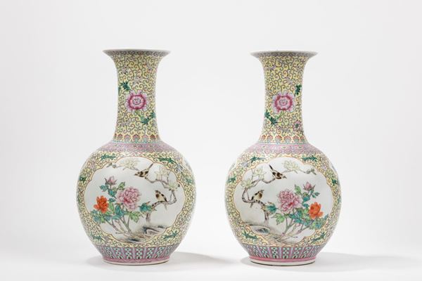 黄地粉彩花鸟瓶一对,中国,中华人民共和国(1949年至今)