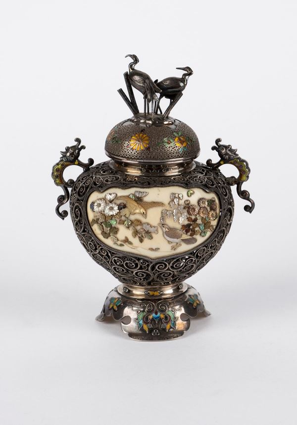 Supported by an elegant silver base with polychrome enamels, with finely pierced silver globular body, the two ivory, mother-of-pearl, and enamel reserves decorated with floral and bird motifs, two removable handles in the guise of a fantastic animal, and the cover with crane pair, signed Miji under the base.CITES certification is available for the following lot.