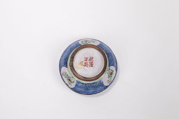 Painted with two figures in a garden; in the centre of the base is the apocryphal four-character red mark of the Qianlong emperor.