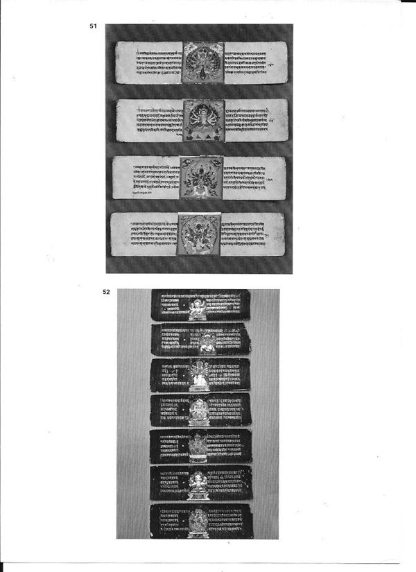 The pages are finely miniated with the figures of a male deity, probably Bhairava, and three female. The three Pancha Raksha, protectors of Buddhism, ride a peacock, a Garuda, a mythical Hindu bird and a pair of mules, while Bhairava is supported by a male figure. The figures are well painted in the center of the pages with precision and effectiveness according to the naturalistic style of Nepalese painting of the eighteenth century; on each page there are characters in Sanskrit.