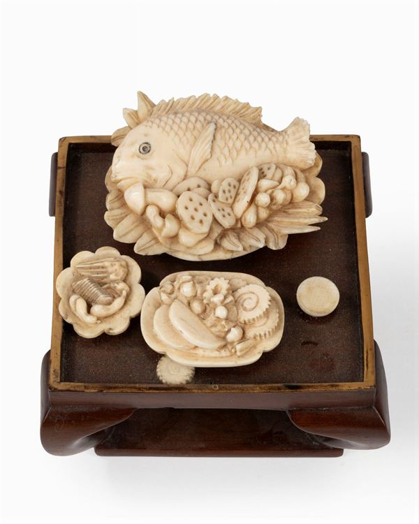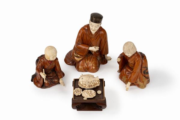 ☼THREE IVORY FIGURES AND A BANQUET, Japan, Meiji period (1868-1912)