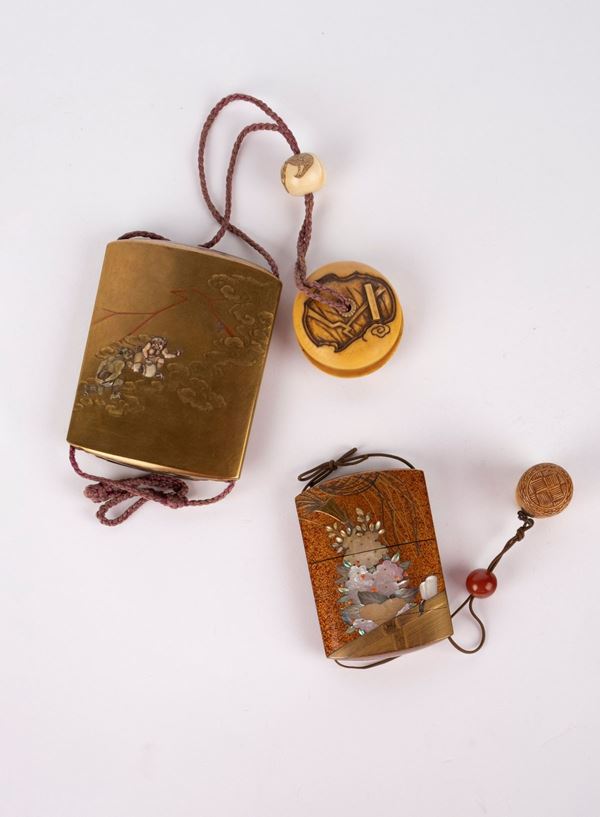 The first in gilded wood with ivory and enamel relief applications depicting a warrior figure with headdress; attached to the lanyard a circular ivory netsuke with oni; the other inro elegantly decorated with Shibayama work, depicting a floral arrangement; attached to the lanyard a very fine basket-shaped bottome with ivory and mother-of-pearl flowers.CITES certification is available for the following lot. 两个 inros印笼。 日本,19 世纪末 (一个是Shibayama,另一个是象牙浮凋)
