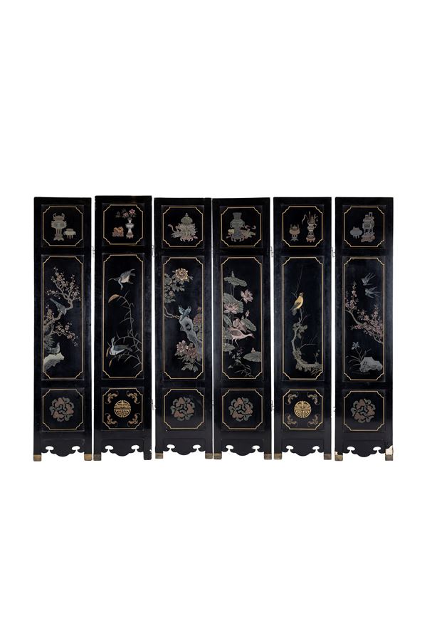 Consisting of six lacquered and carved panels with archaistic motifs, each panel is decorated with three reserves: the round ones at the top are enriched with carved jades and hard stones in the shape of literary objects, the lobed rectangular ones in the middle are decorated with jades and gilding depicting characters in different landscapes, and the lobed square ones at the bottom are decorated with jades and hard stones in the shape of literary objects; the back is engraved and painted with flowers and birds, antiquities and symbols of happiness shou, bats and double gourds.