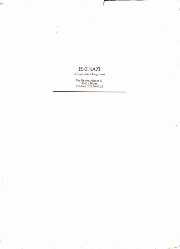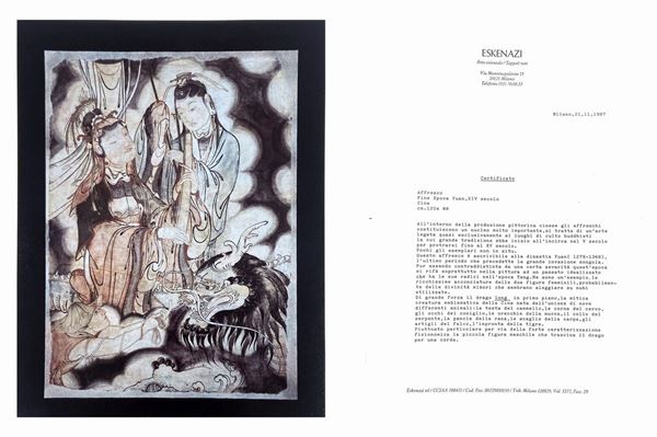 Painted in polychrome enamel, it depicts two female figures riding a dragon pulled by a nose ring tied to a string by a male figure. Accompanied by a certificate on Eskenazi letterhead dated 1987.