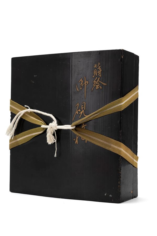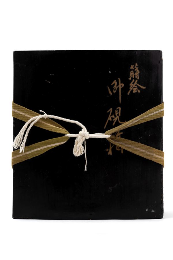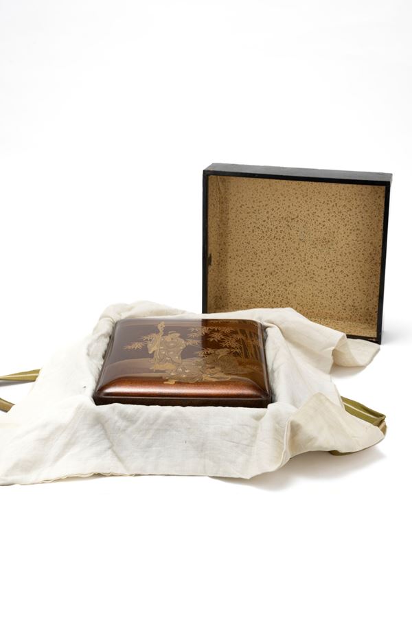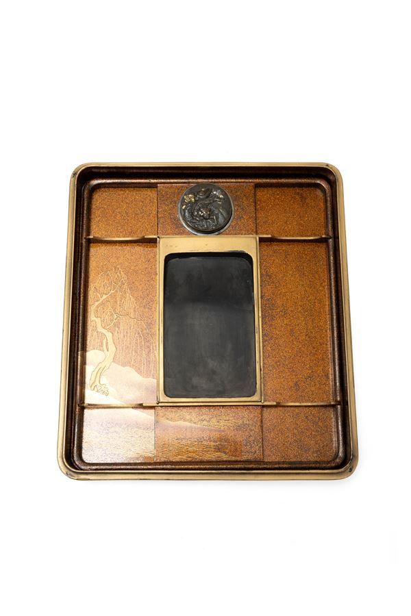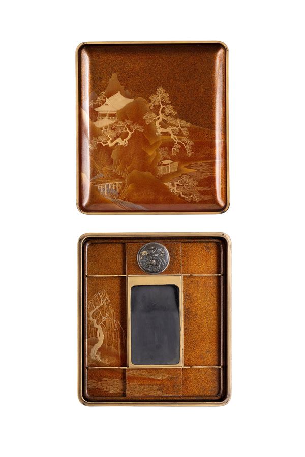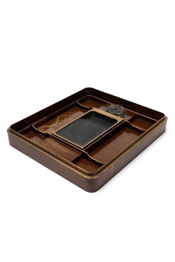 Depicting two sages at the foot of a bamboo plant on the lid, the interior finely decorated with a landscape; it contains the ink stone and a cylindrical-shaped bronze paperweight finely depicting a lion; it comes with his wooden box (cm 10 x 27,5 x 30,5).