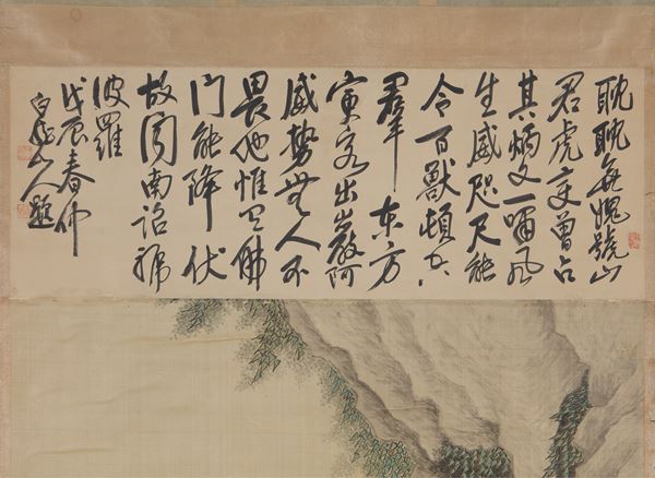Depicting a tiger near a rock, with inscriptions above on paper.