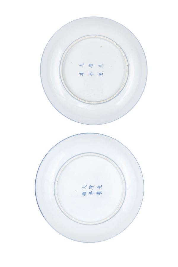 Decorated with lotus scrolls, at the center of the base, they bear the six-character underglaze blue mark of Emperor Guangxu.