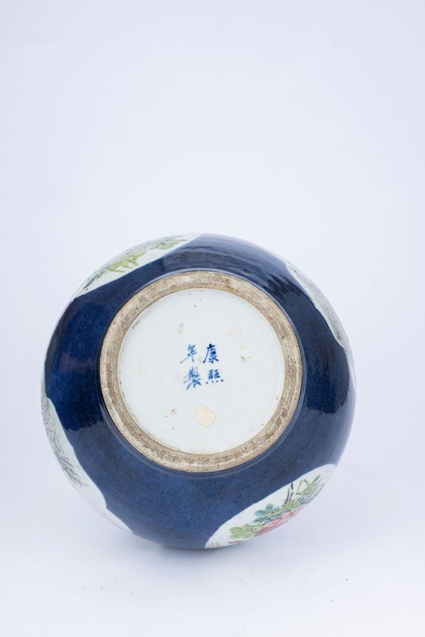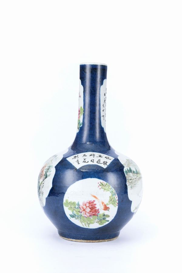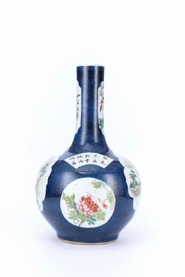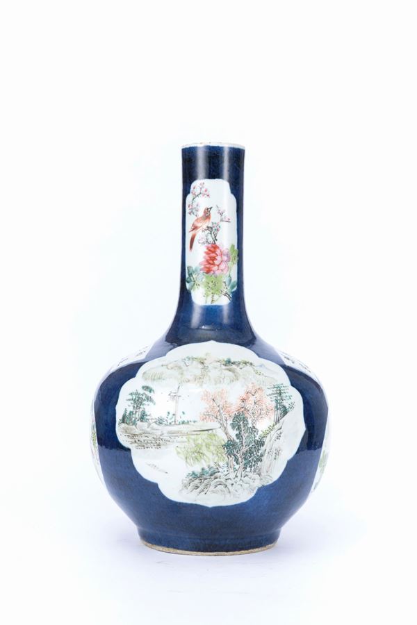 Nicely painted on a powder blue ground, the body features two lobed reserves in the center of the globular body depicting landscapes with trees and mountains. On the sides, there are two round reserves with flowers and birds, above which there are two fan-shaped reserves with inscriptions. On the long neck, there are two lobed rectangular reserves, one with flowers and birds, and the other with inscriptions including the signature of the artist Wenxin (文心).