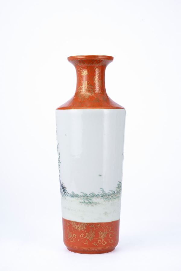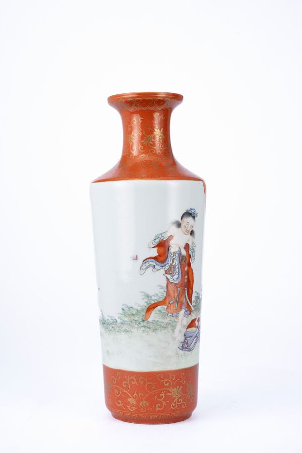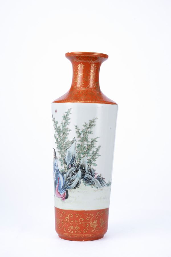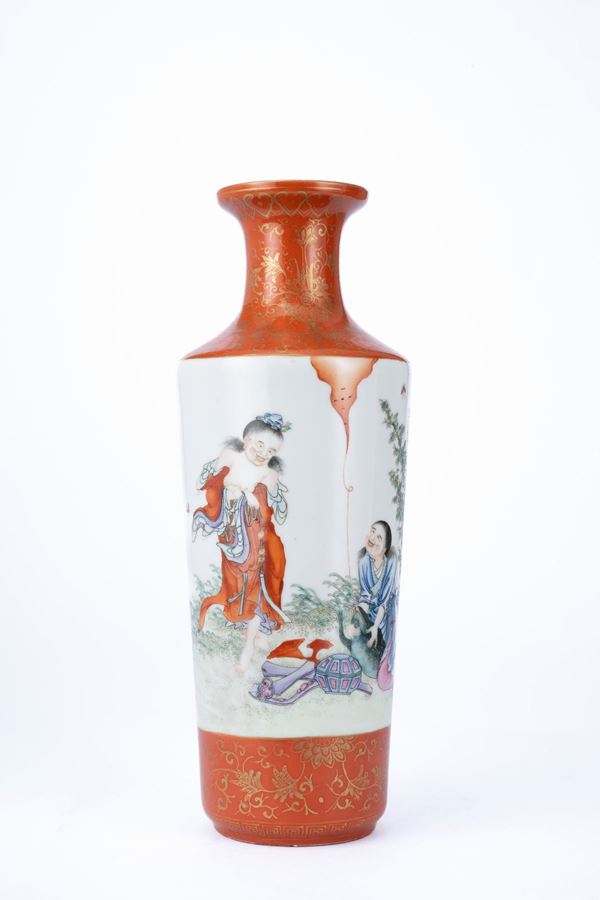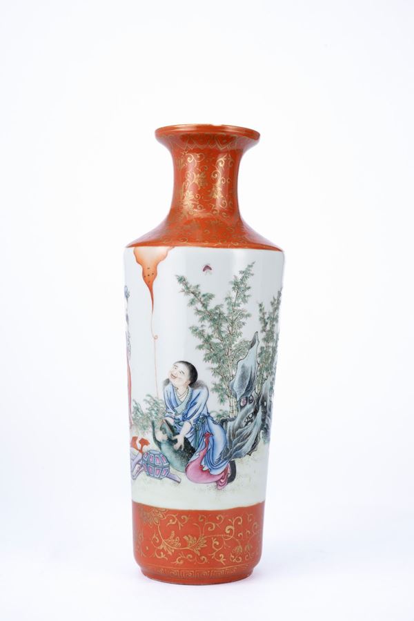 A RARE GILT CORAL GROUND AND FAMILLE ROSE PORCELAIN BALUSTER-SHAPED VASE, China, Republic Period (1912-1949)