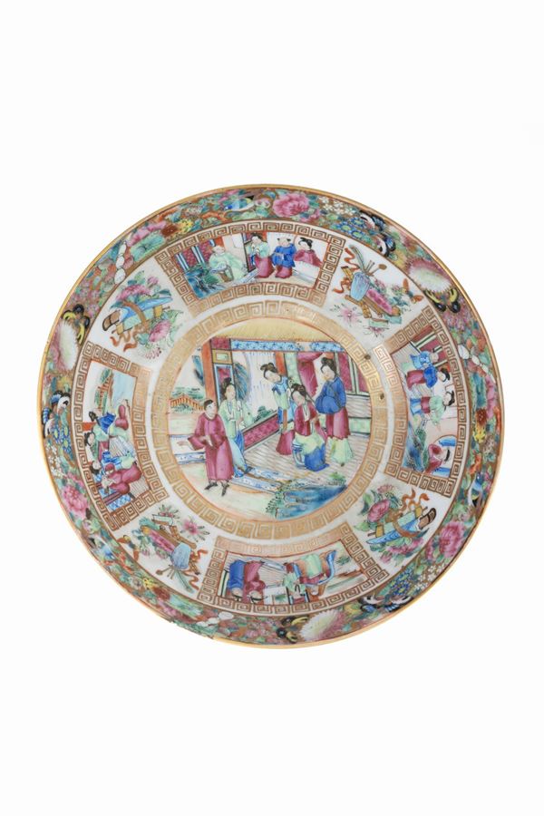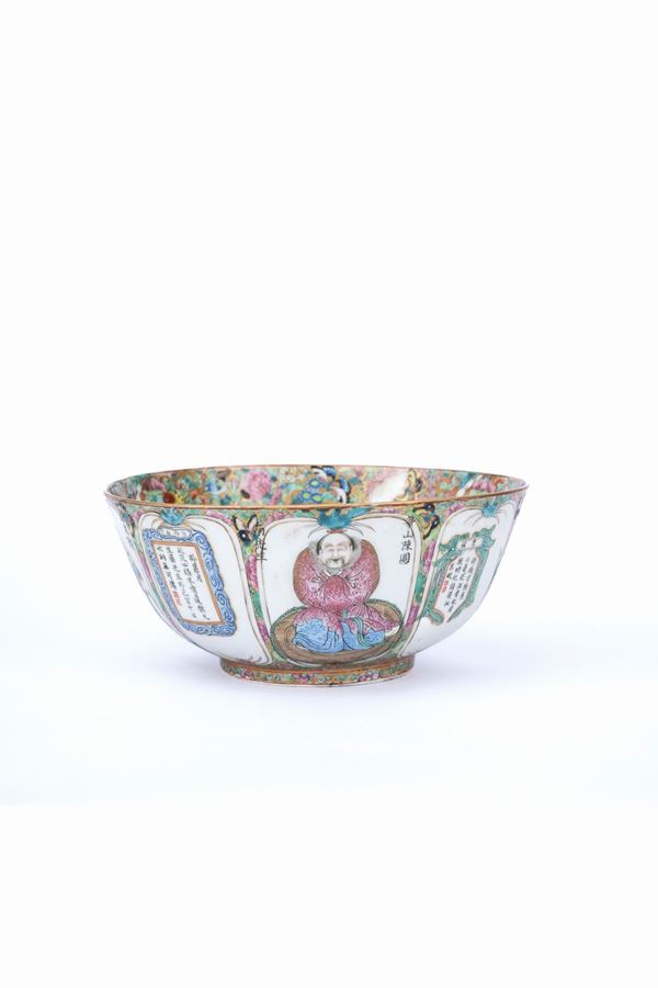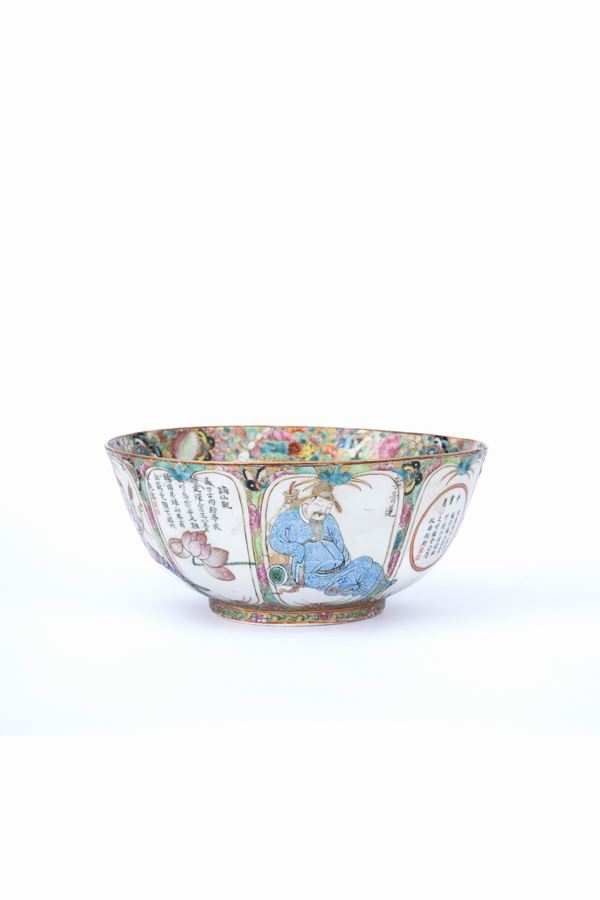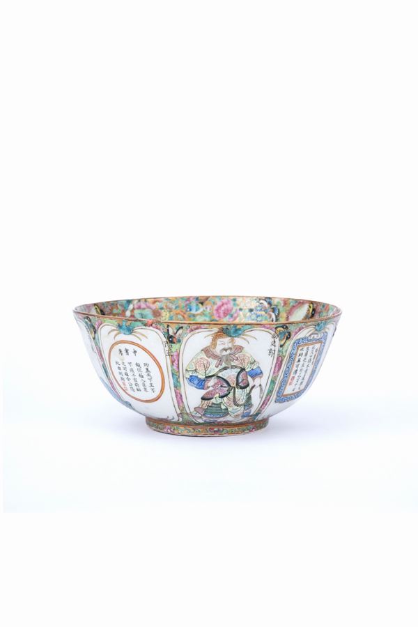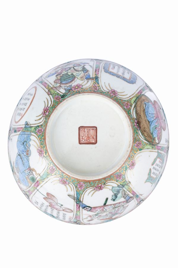 Well-painted on the outside in famille rose colours and in typical Cantonese style with gourd-shaped reserves in which inscriptions and characters are alternated; on the inside there is the classic canton rose medallion decoration with court scenes; in the centre of the base it bears the six-character seal mark in overglaze red of the Emperor Xianfeng.