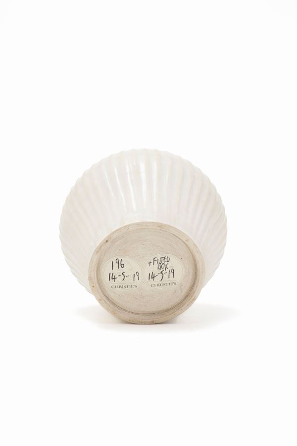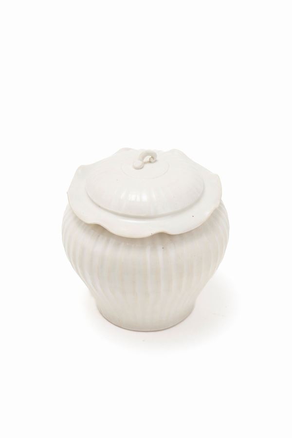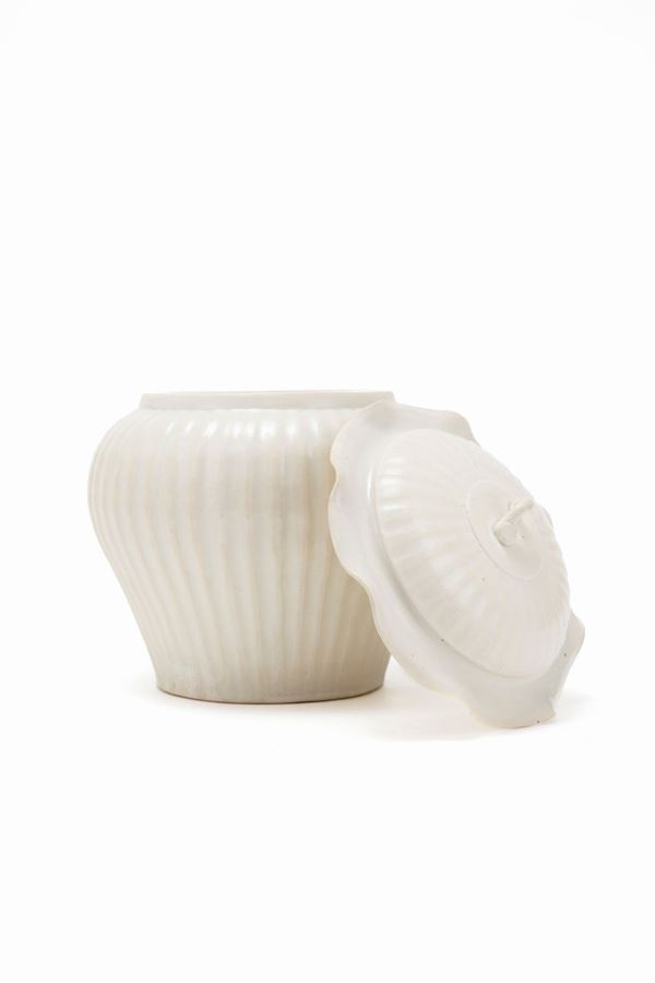 Of classic shape resting on a flat foot, it is lobed across the entire body and the lid, which features a wavy edge; it is completely covered with an ivory glaze.