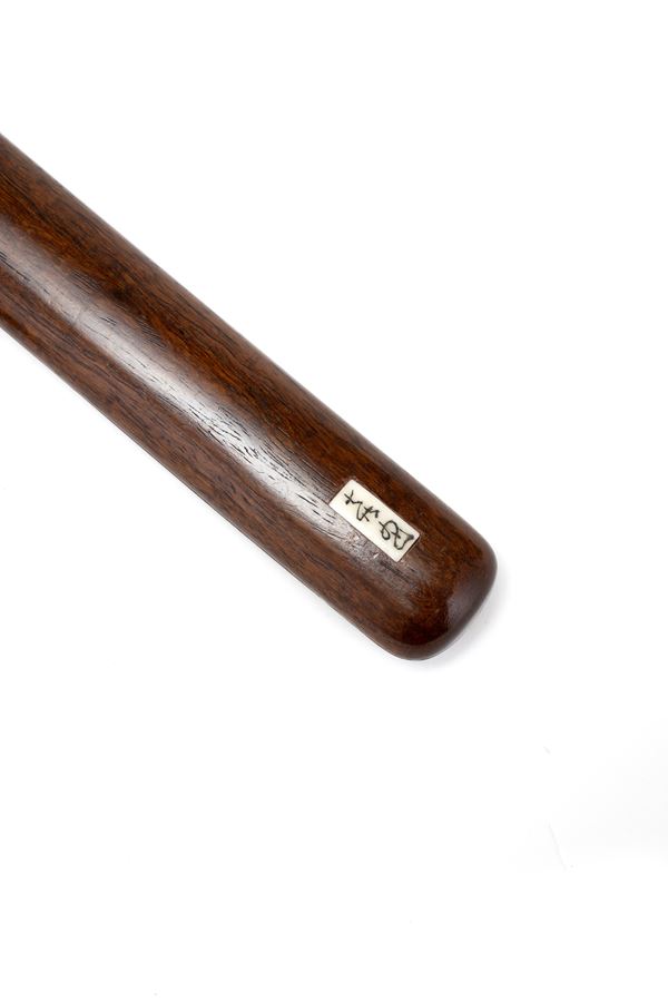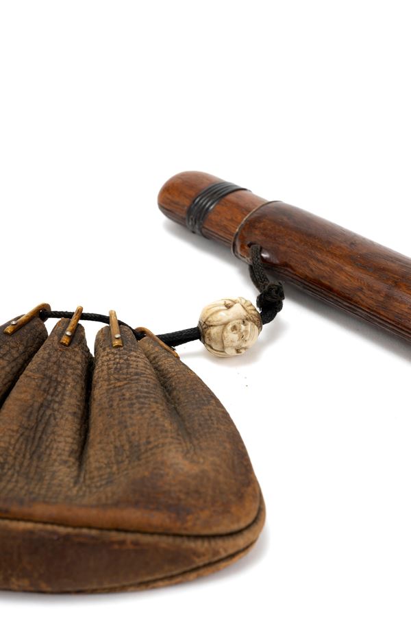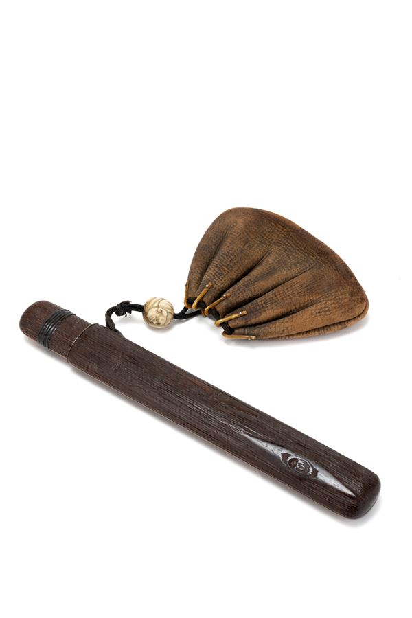Complete with a pipe holder (kiseru) made of wood and a tobacco pouch made of leather; signed.
