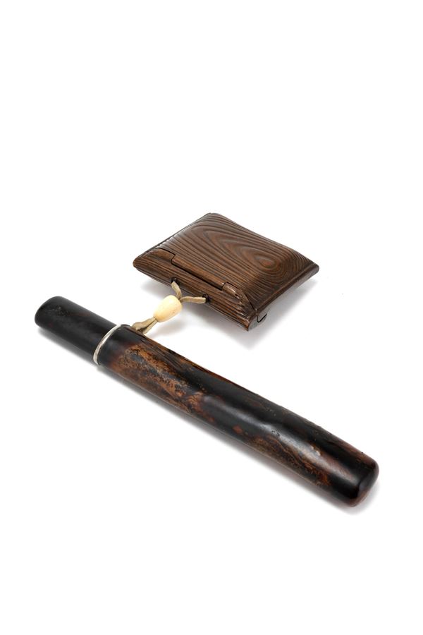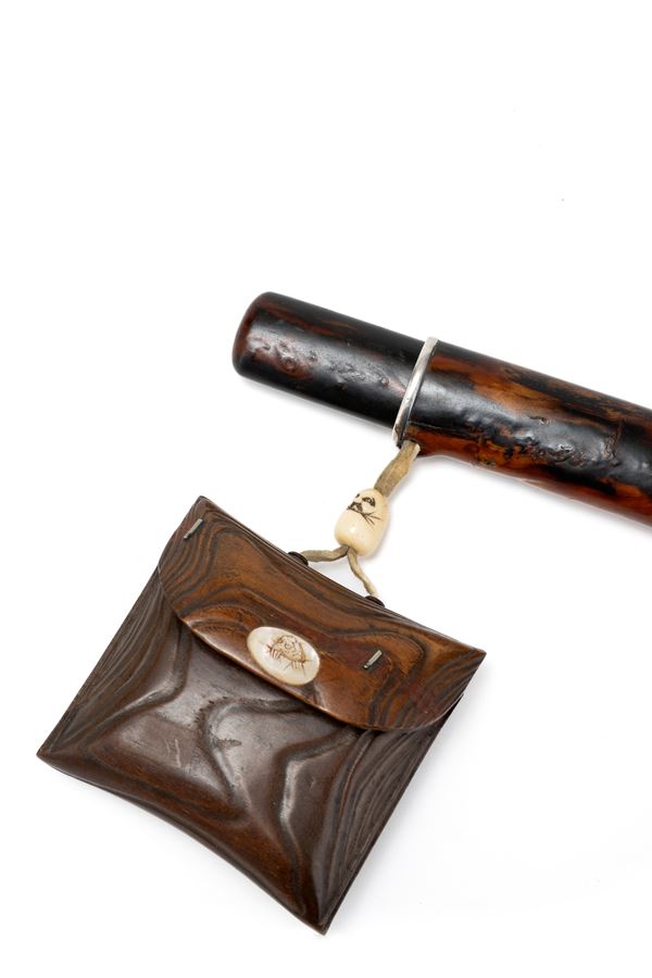 Complete with a pipe holder (kiseru) and a tobacco pouch made of wood.