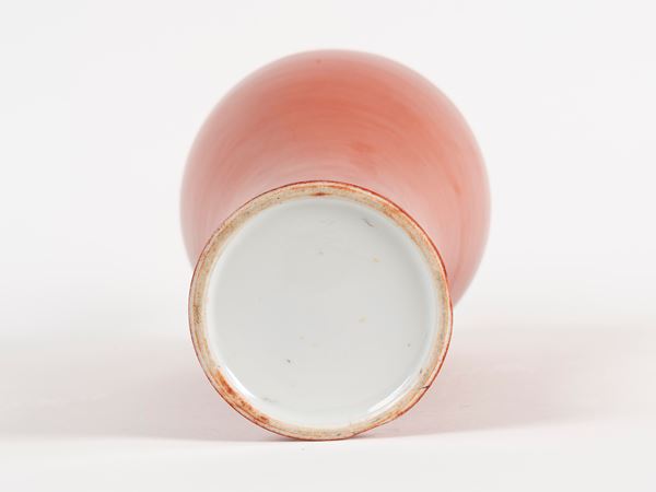 Of pseudo-meiping shape, with a sinuous body starting from a flat foot and widening at the shoulders to culminate in a narrow, long tubular neck, it is entirely covered with a thin red glaze.
