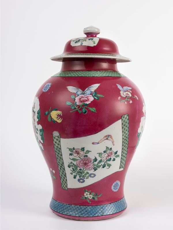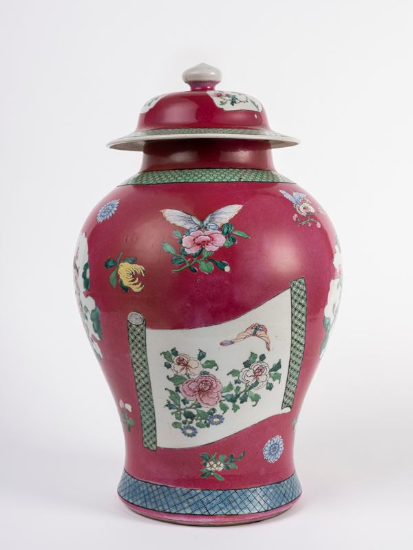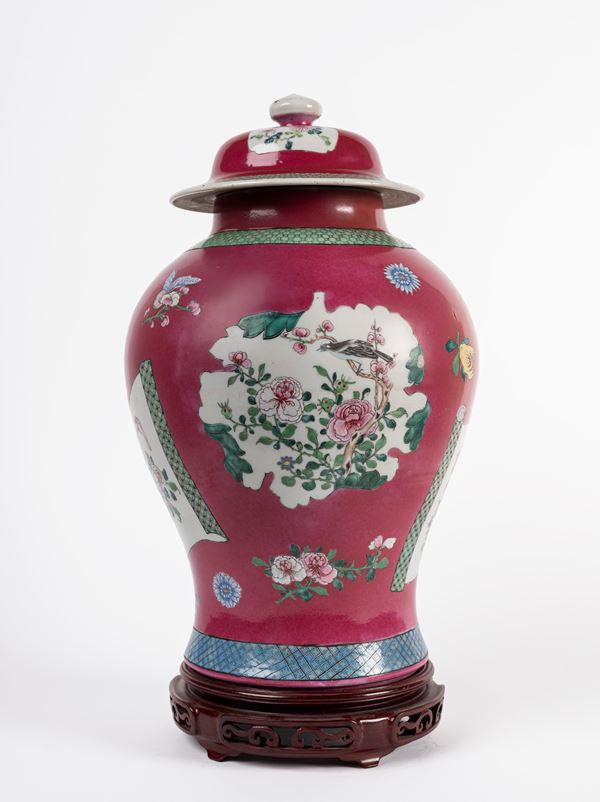 Jar with cover (once part of a five-piece garniture) with ruby-red as background, two opened calligraphy scrolls depicting floral and butterfly motifs, and floral motifs and birds presented in the reserved panels, green and blue brocade ground decoration are finely painted on the shoulder and the rim of the base. Together with a wood stand.