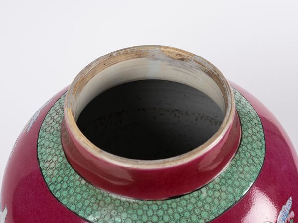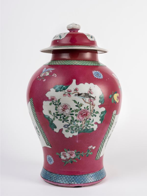 粉彩胭脂红地开窗花卉将军罐,中国,清朝,雍正时期(1723-1735)