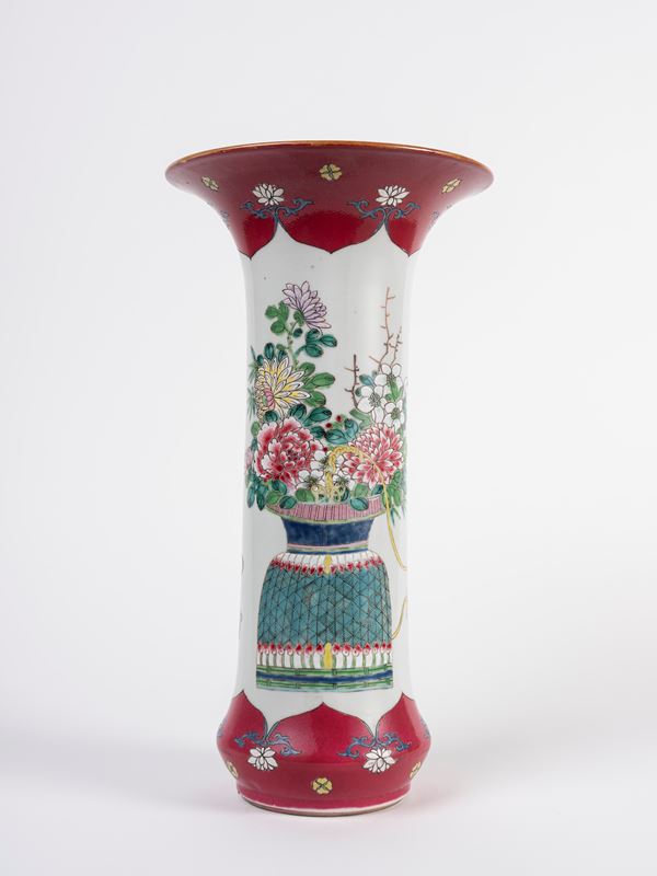 Sleeve vase (once part of a five-piece garniture) with ruby-red as background, prosperous flowers played in porcelain vases as decoration in reserved, representing an auspicious meaning.