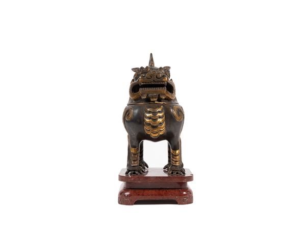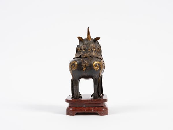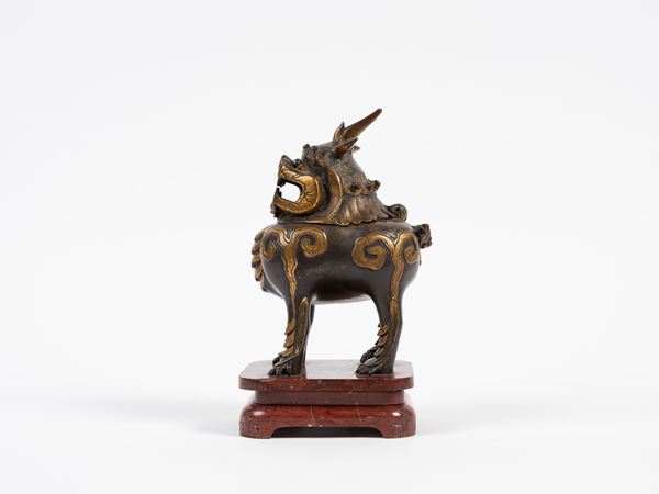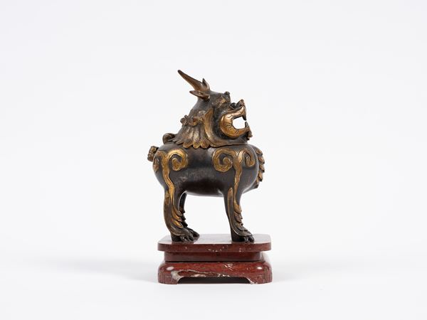 Well cast in the shape of a luduan, it is finely chiseled and decorated on the body with spirals; the head is movable and perforated to allow the escape of fumes, resting on a stone base.