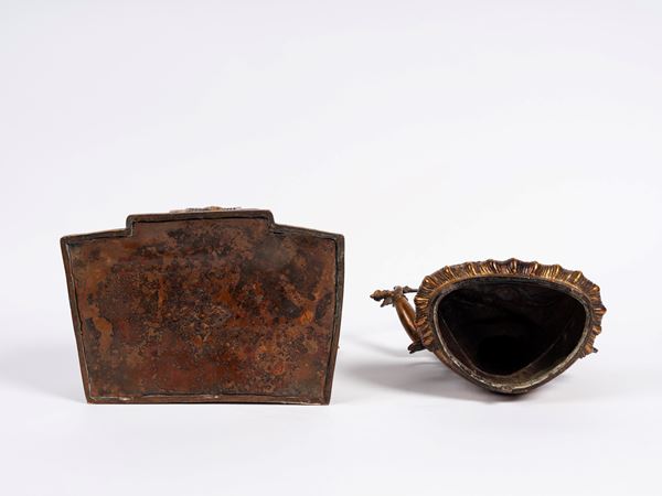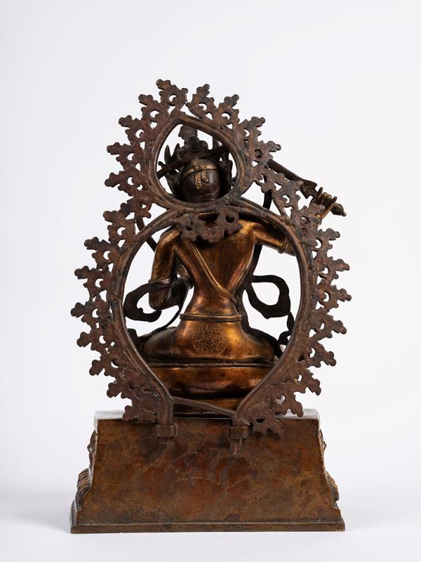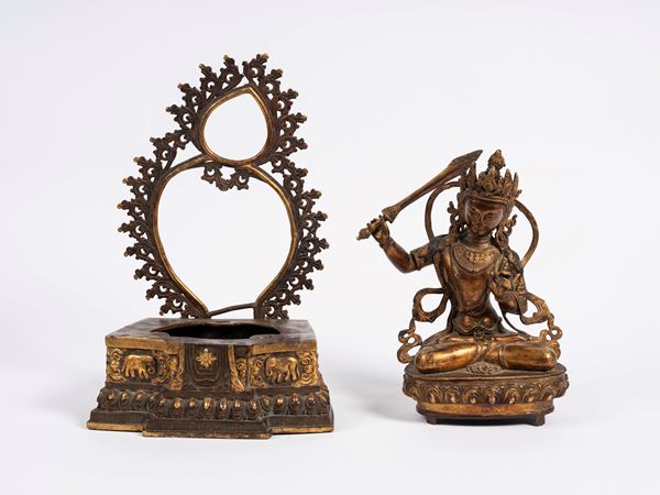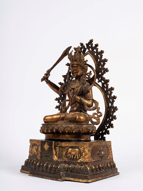 Seated in dhyanasana on a lotus base, his right hand raised holding a sword, and his left hand holding the Prajnaparamita Sutra. The figure rests on a pedestal from which a flame rises behind him.