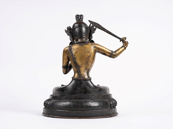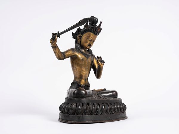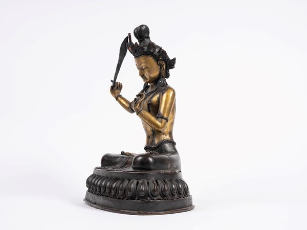 Seated in dhyanasana on a lotus base, holding a raised sword in his right hand and the Prajnaparamita Sutra in his left. He wears a chiseled dhoti that leaves his torso exposed, along with jewelry, a crown, and earrings adorned with turquoise and hard stones.