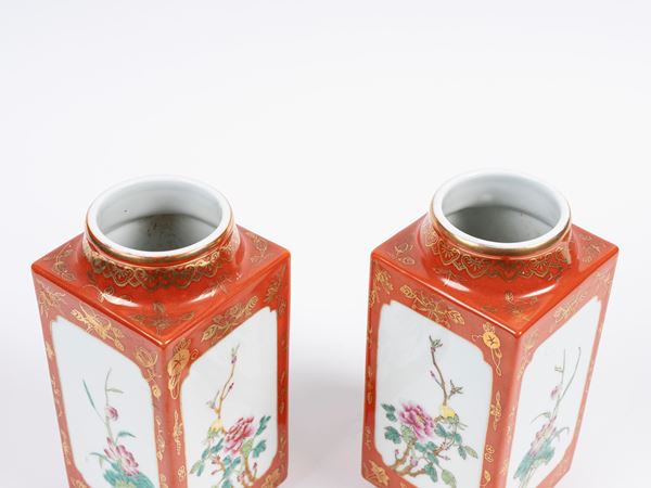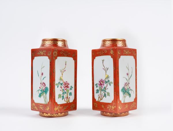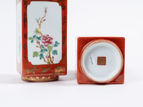 粉彩珊瑚红描金开光花卉纹方瓶,中华人民共和国(1949 年至今)