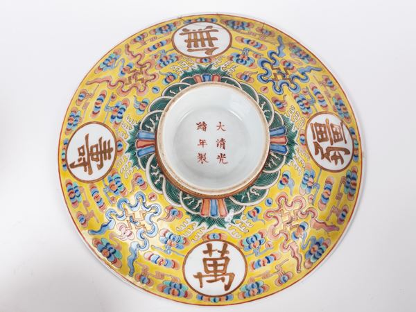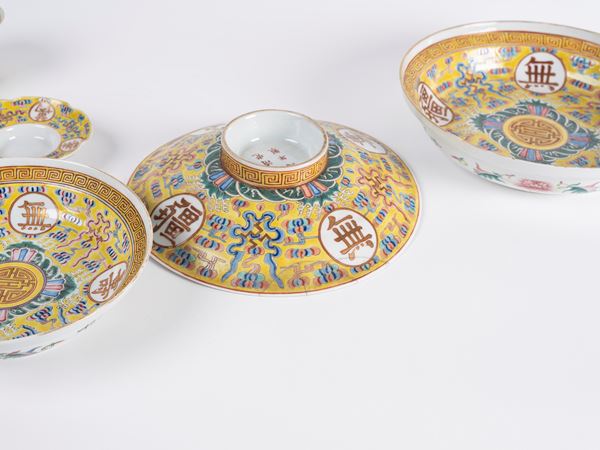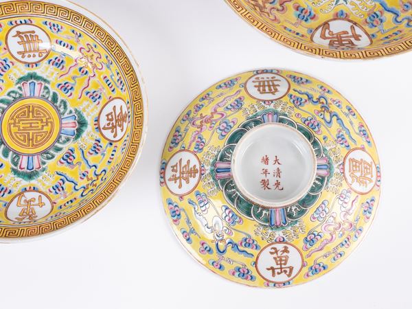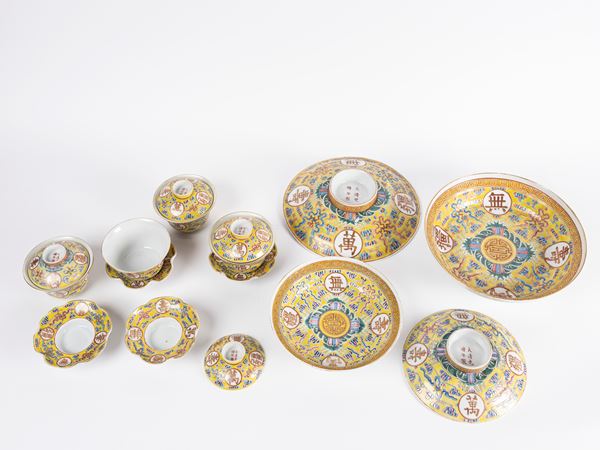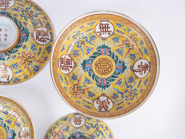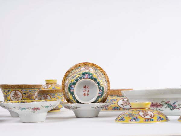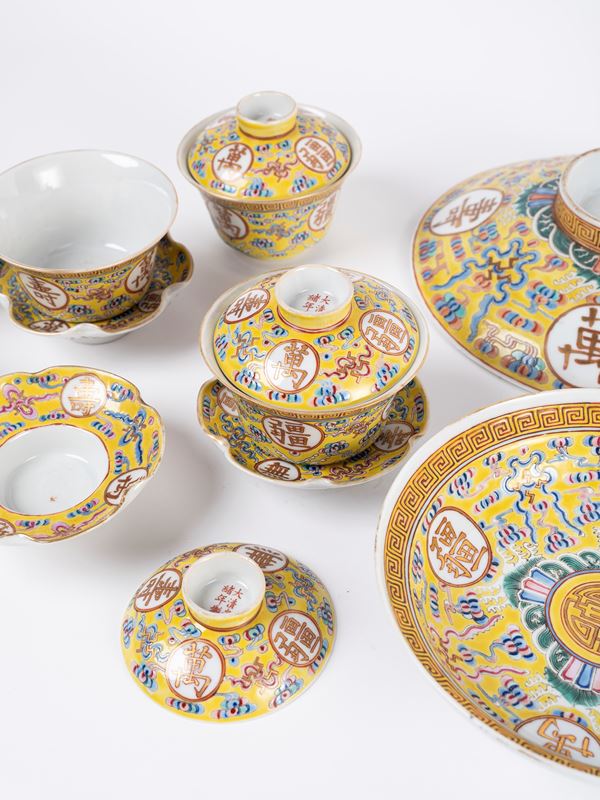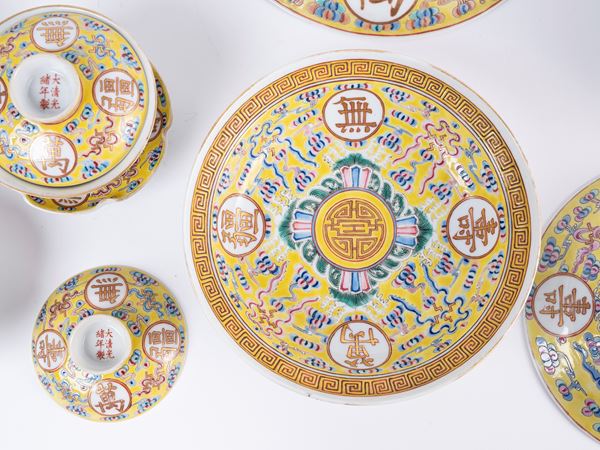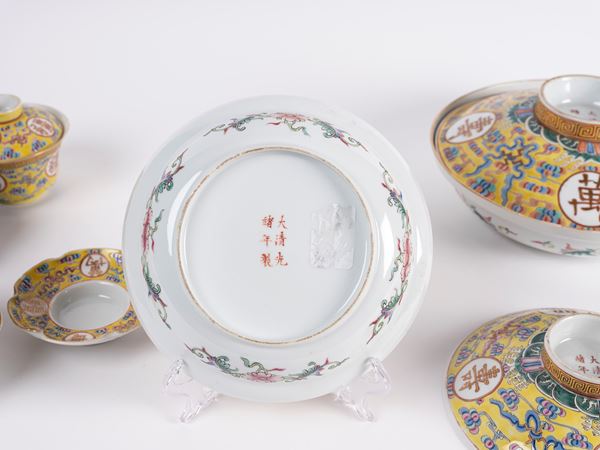 A set of yellow-ground famille-rose 'longevity' dishes and soup bowls bear iron- -red Da Qing Guang Xu Nian Zhi six-character mark on the cover and the base.