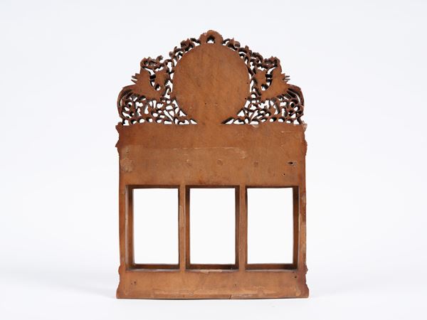 Finely carved and decorated in relief with auspicious symbols, it features four columns supporting a central rosette held by two mythological animals, enclosing a scene with figures in a landscape among animals and clouds. The pediment, made up of three panels, displays masks holding medallions that enclose figures.