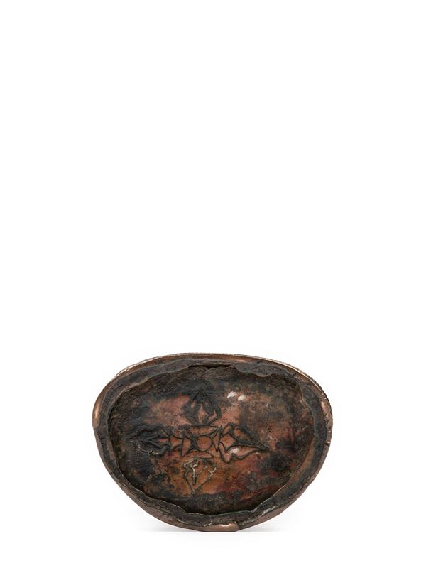Seated in dhyanasana on a double-lotus pedestal, holding a flower that supports a vase in his hands.