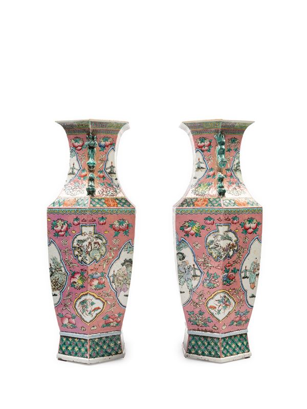 粉彩双耳六方瓶一对,中国,十九世纪初/二十世纪末