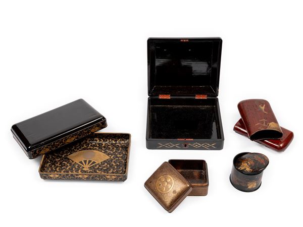One is rectangular with a black lacquered exterior and a gold-lacquered interior featuring a fan; another is square with a black lacquered base, decorated in gold and red lacquer with fans; a small circular box in black lacquer depicts children at play; a rectangular box in gold lacquer features geometric patterns; and one in red lacquer shows a bird in a mountainous landscape.