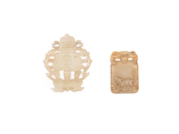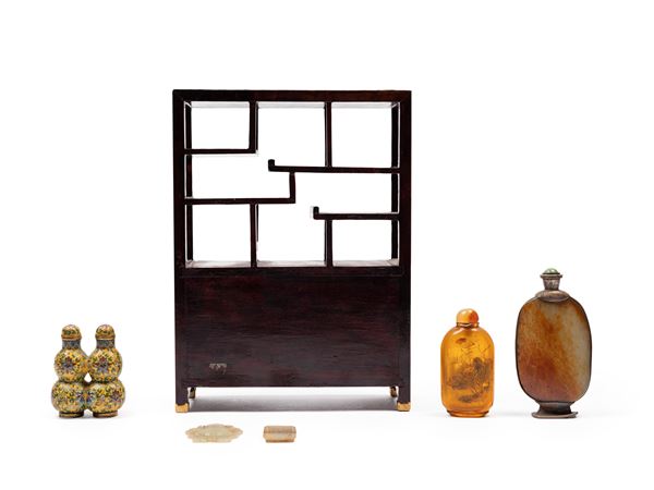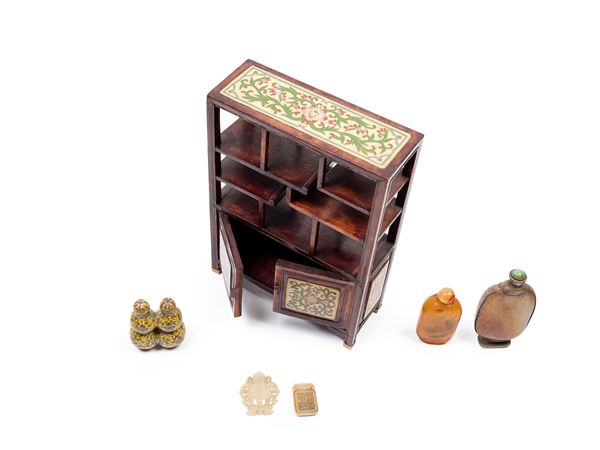 Comprising a small wooden cabinet with doors decorated in cloisonné enamel with floral motifs; two small jade carvings, one in the shape of a vase and the other rectangular with two cats; a double snuff bottle shaped like a double gourd in cloisonné enamel on a yellow ground decorated with lotus flowers; one in agate with a silver overlay adorned with floral motifs; and one in glass with a hardstone stopper, decorated on one side with two figures in a field observing a crane, and on the other with a cricket on a plant.