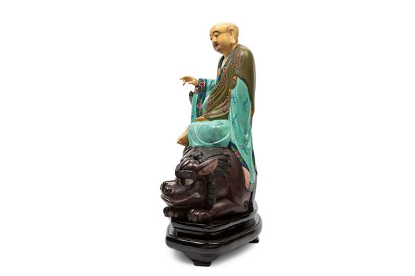 Depicting a figure seated atop a mythological creature.