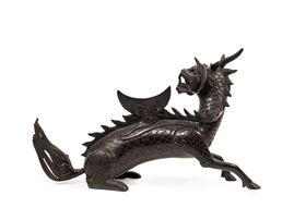 Depicting a kirin shown looking back over its shoulder. The body, resembling that of a deer, is enhanced with a flaming mane and, amid stylized clouds, supports a crescent-shaped base.