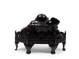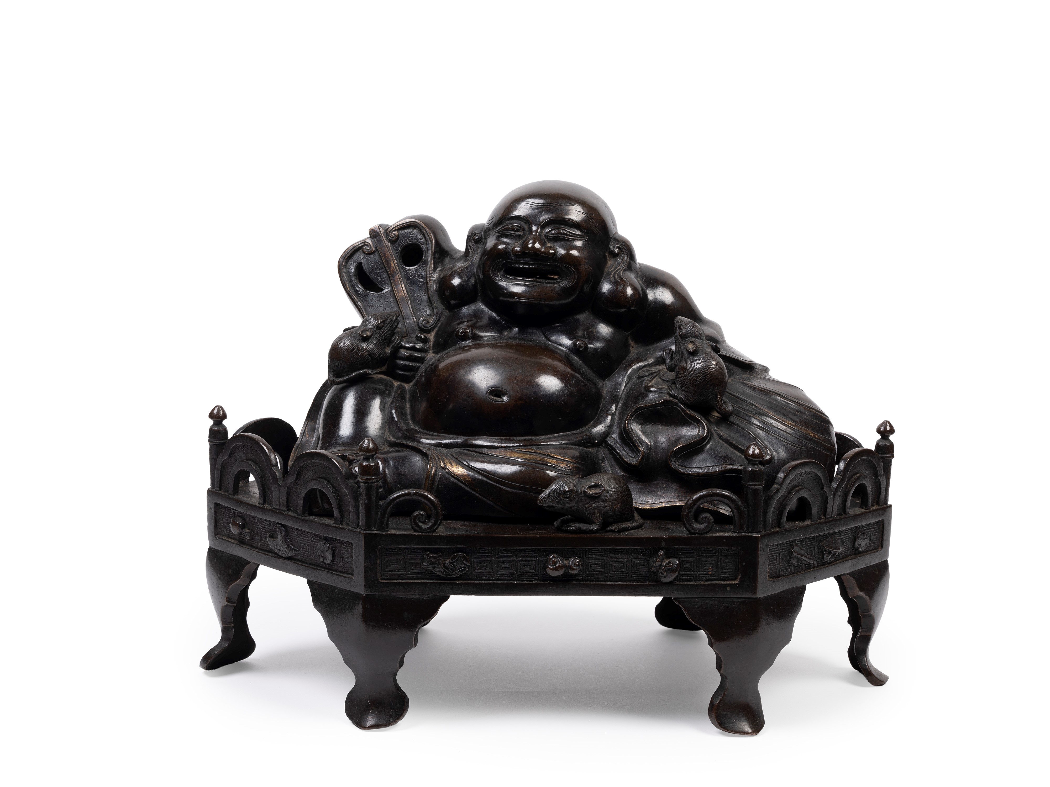Depicting a smiling Hotei seated on a six-legged raised base, while three mice play with him.