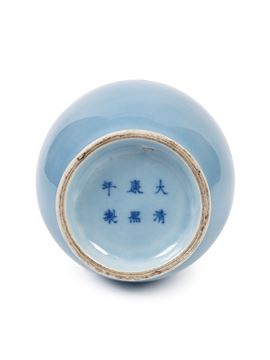 Of classic bottle form, with a globular body rising to a slender neck with a slightly flared mouth, entirely covered with a blue glaze. The base bears a six-character underglaze blue mark of the Kangxi Emperor.
